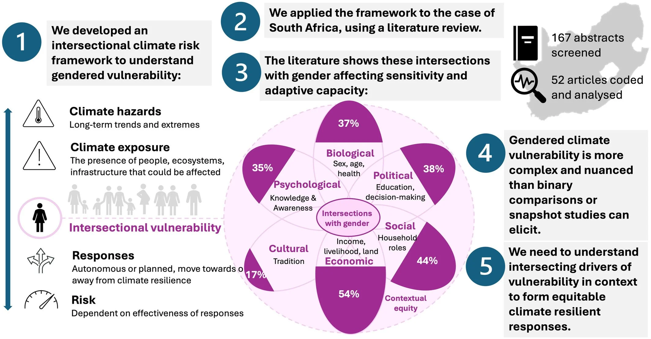 Stadler L, Benya S, Ziervogel G, and Holden P. (2025). Integrating intersectionality into climate risk assessments: Review of gendered vulnerability in South Africa. Wiley Interdisciplinary Reviews: Climate Change. https://doi.org/10.1002/wcc.70035